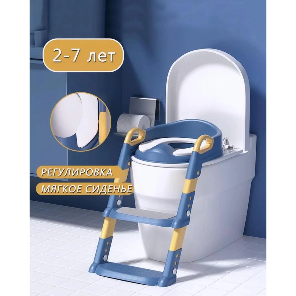 Детское сиденье на унитаз мягкое со ступенькой и лесенкой, цвет Голубой ( PU сиденье)