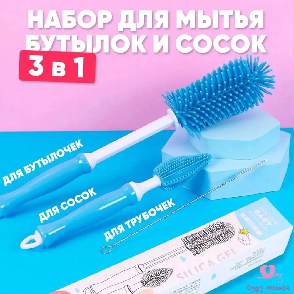 Силиконовый ершик для бутылочек 3 в 1, синий