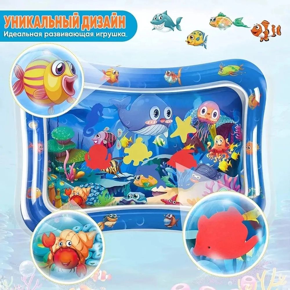 🔸Внутри водяного коврика для малышей размещены игрушки в форме морских звезд, осьминогов, черепашки.