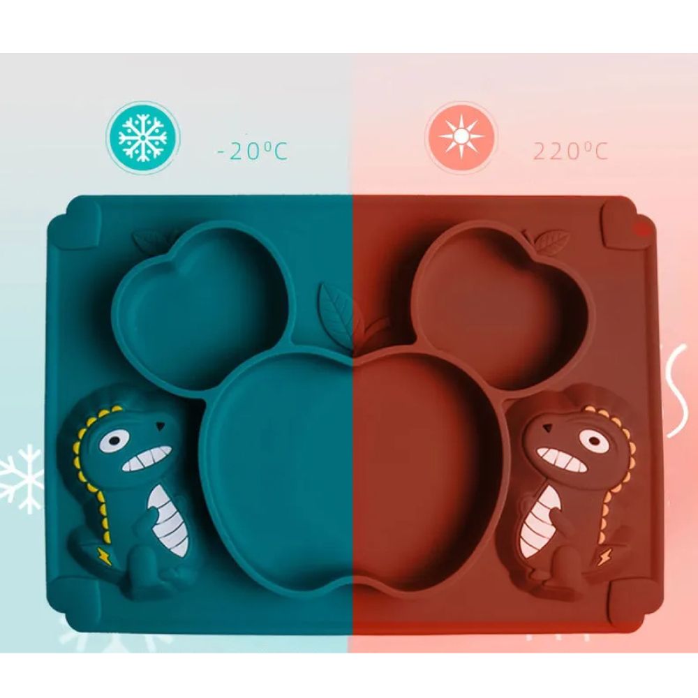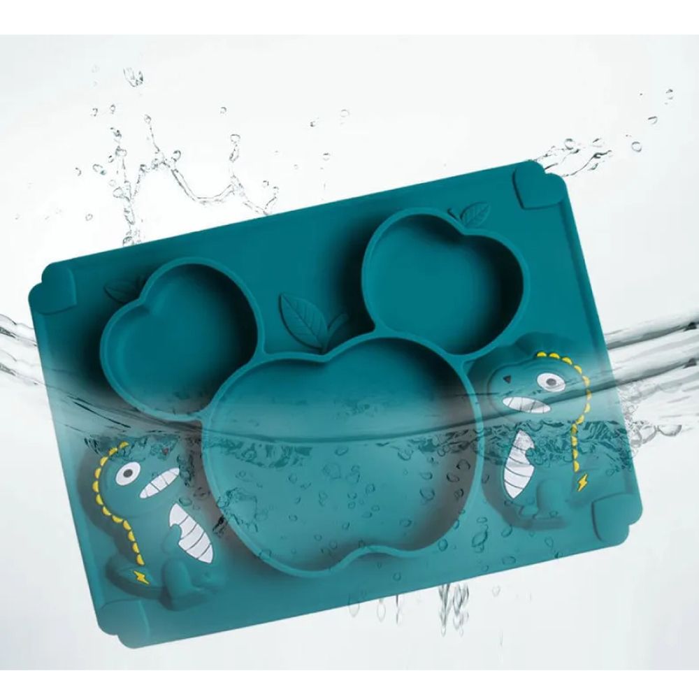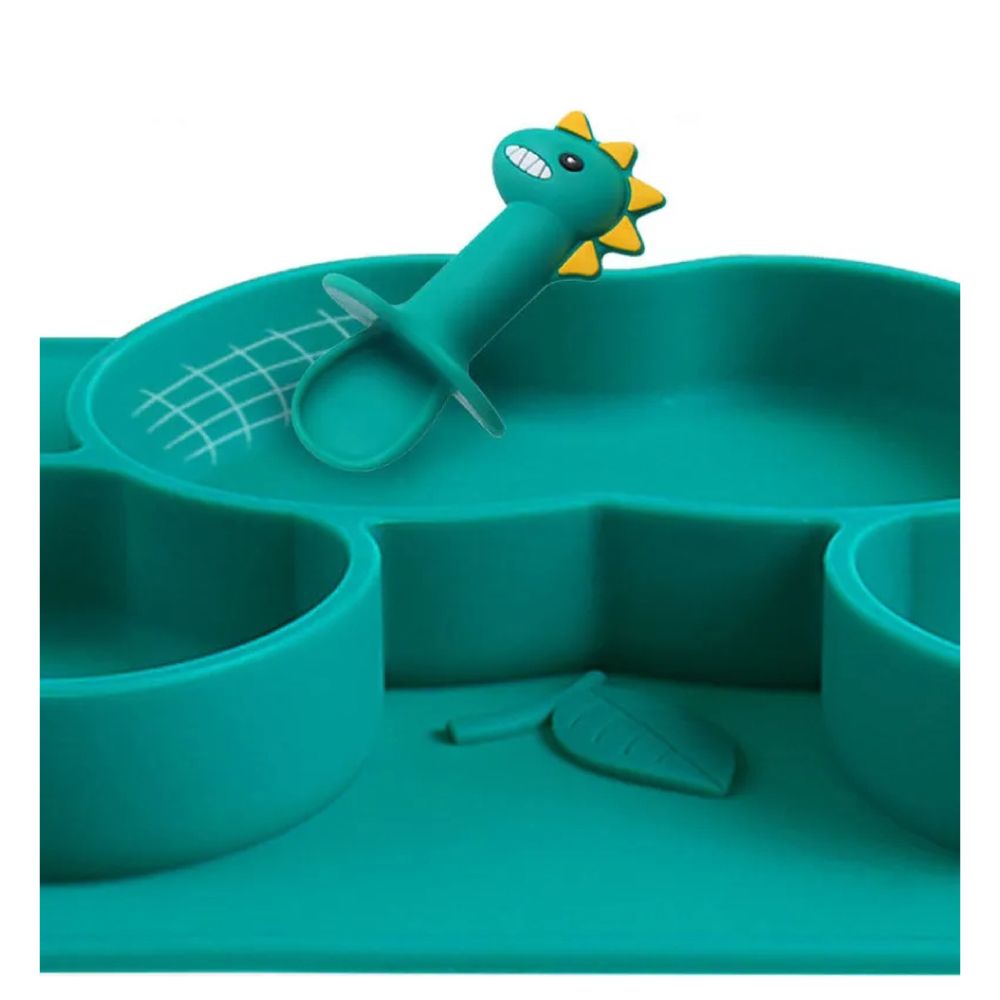 Набор для кормления силиконовый на присоске. Тарелка на присоске с ложкой и вилкой. Сделана из пищевого силикона, безопасный материал для малышей. Не имеет запаха, легко моется, не впитывает запахи и не окрашивается. Приятная на ощупь. Не содержит Бисфенол А (BPA free). Присоска на дне, надежно фиксирует тарелку. Форма в виде динозавра привлечет вашего малыша. Посуду из силикона можно мыть в посудомоечной машине и разогревать в микроволновке, стерилизовать и кипятить. Можно разогревать до 250 градусов. Тарелка: длина 20 см, ширина - 28 см., высота - 2 см. Ложки: 5 гр., длинна 13 см., ширина 2.5 см. В набор входит : тарелка, маленькие ложка и вилка, две ложки побольше.
