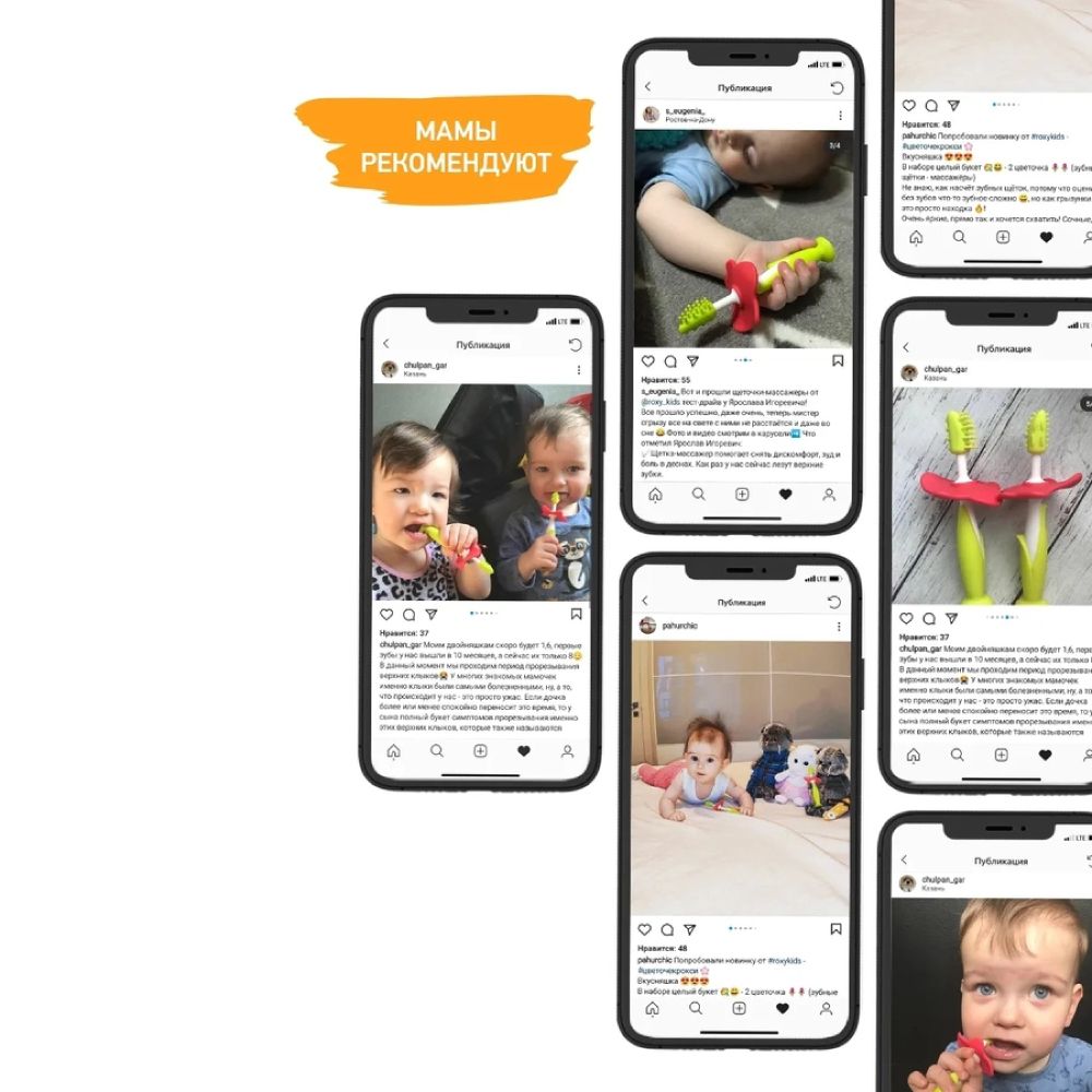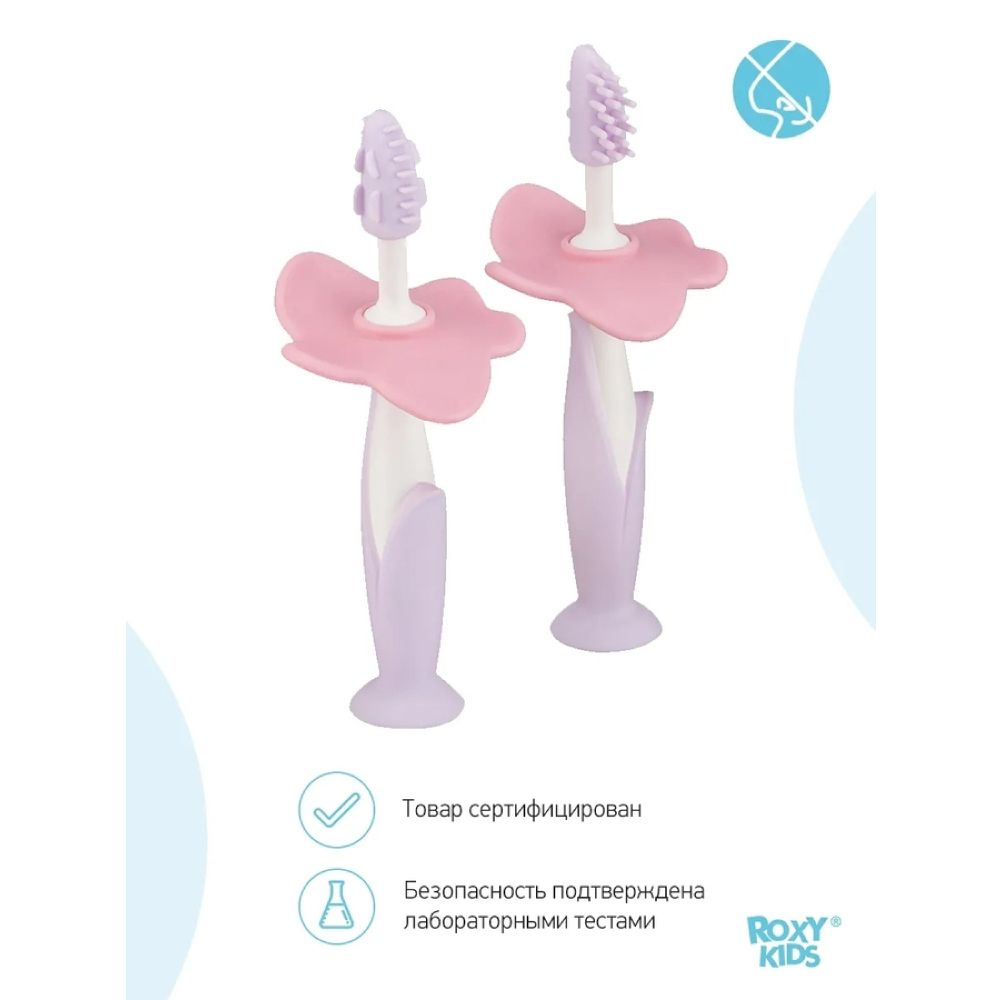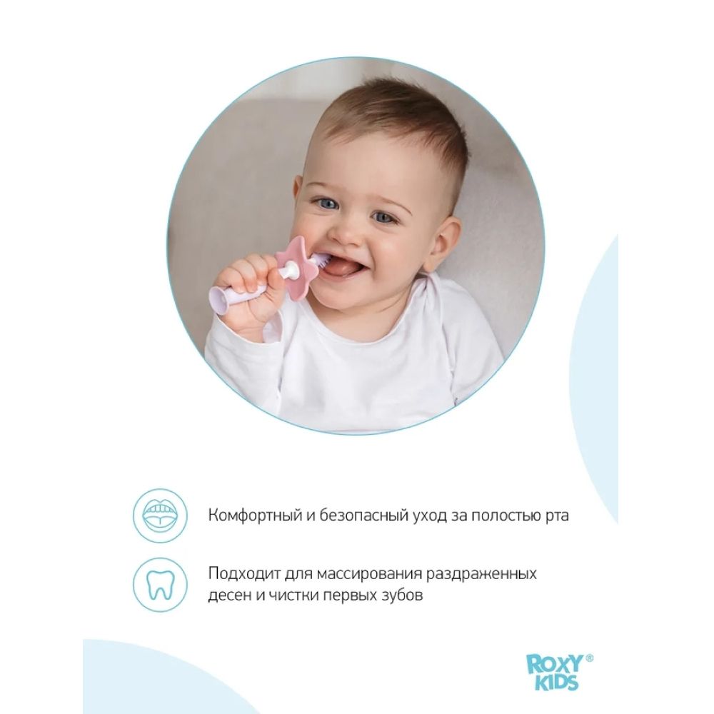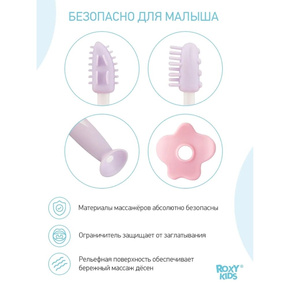 Набор зубных щеток-массажеров ROXY-KIDS предназначен для комфортного и безопасного ухода за полостью рта ребенка с первых месяцев жизни. Подходит для массирования раздраженных десен и чистки первых зубов.