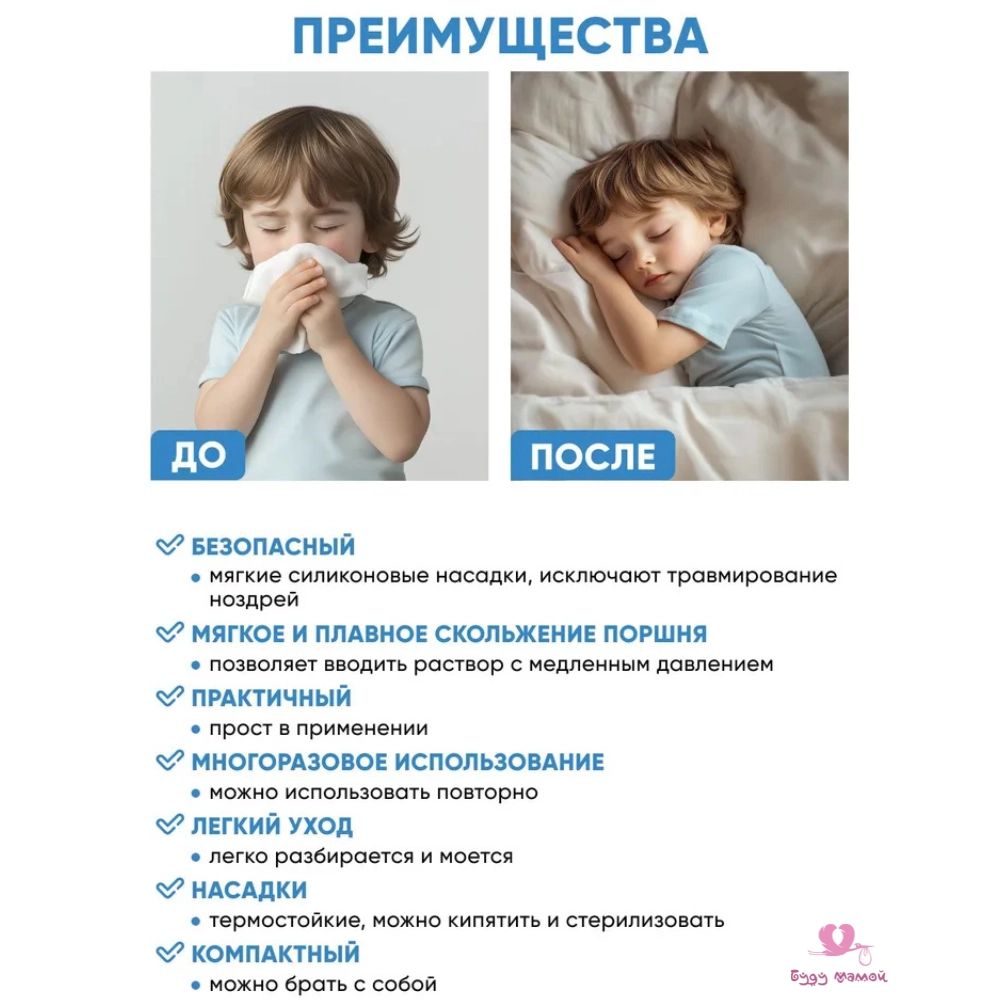 🔸Детский шприц для промывания носа - это портативный и эффективный ирригатор, который предназначен для ухода за детьми всех возрастов. Он обеспечивает безопасную и эффективную чистку носа, полости рта, зубов, а также помогает устранить назальную заложенность и прочистить назальный проход.